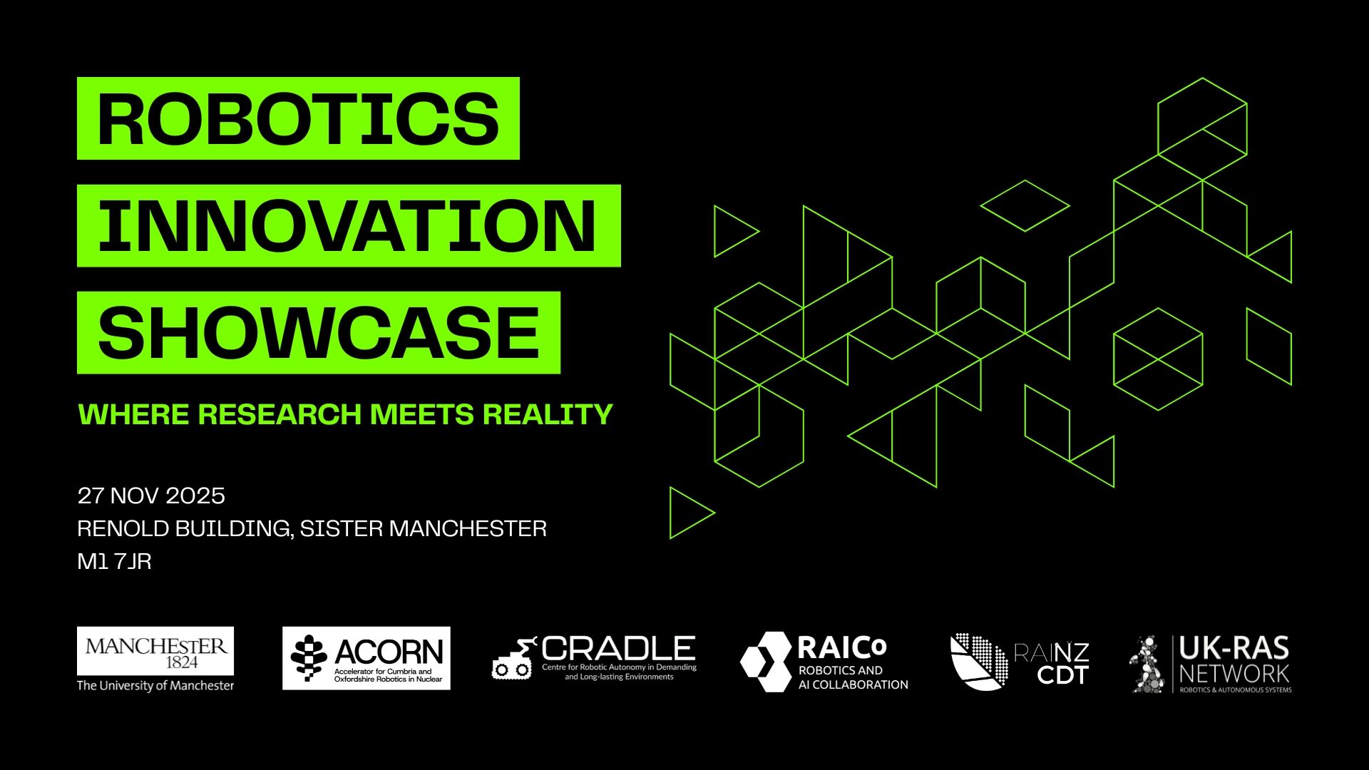 Hosted by: • The University of Manchester – Centre for Robotics and AI • CRADLE (Centre for Robotic Autonomy in Demanding and Long-lasting Environments) • RAICo (Robotics and AI Collaboration) • RAINZ CDT (EPSRC Centre for Doctoral Training in Robotics and AI for Net Zero) • UK-RAS Network • Featuring the launch of ACORN (Accelerator for Cumbria and Oxfordshire Robotics in Nuclear)